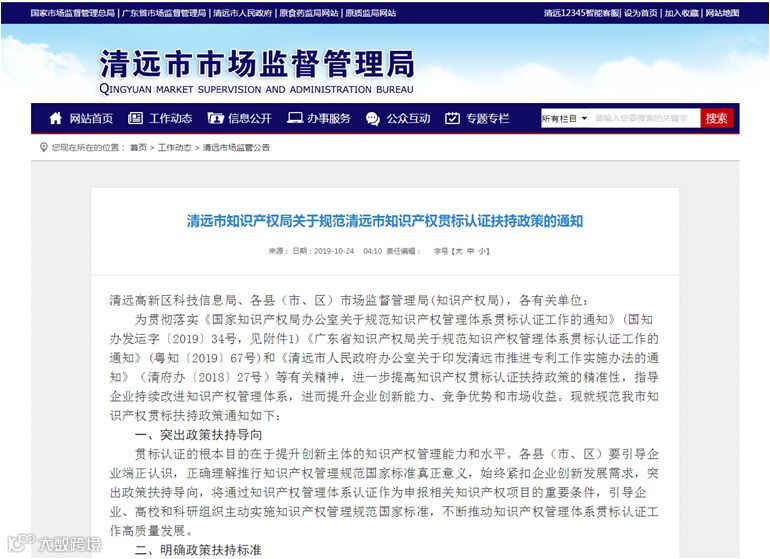 为贯彻落实《国家知识产权局办公室关于规范知识产权管理体系贯标认证工作的通知》(国知办发运字〔2019〕34号,见附件1)《广东省知识产权局关于规范知识产权管理体系贯标认证工作的通知》(粤知〔2019〕67号)和《清远市人民政府办公室关于印发清远市推进专利工作实施办法的通知》(清府办〔2018〕27号)等有关精神,进一步提高知识产权贯标认证扶持政策的精准性,指导企业持续改进知识产权管理体系,进而提升企业创新能力、竞争优势和市场收益。现就规范我市知识产权贯标扶持政策通知如下: