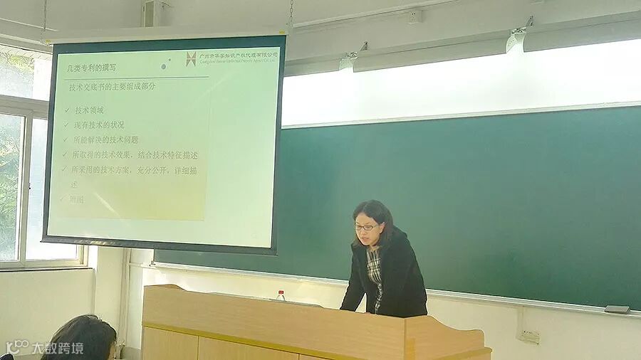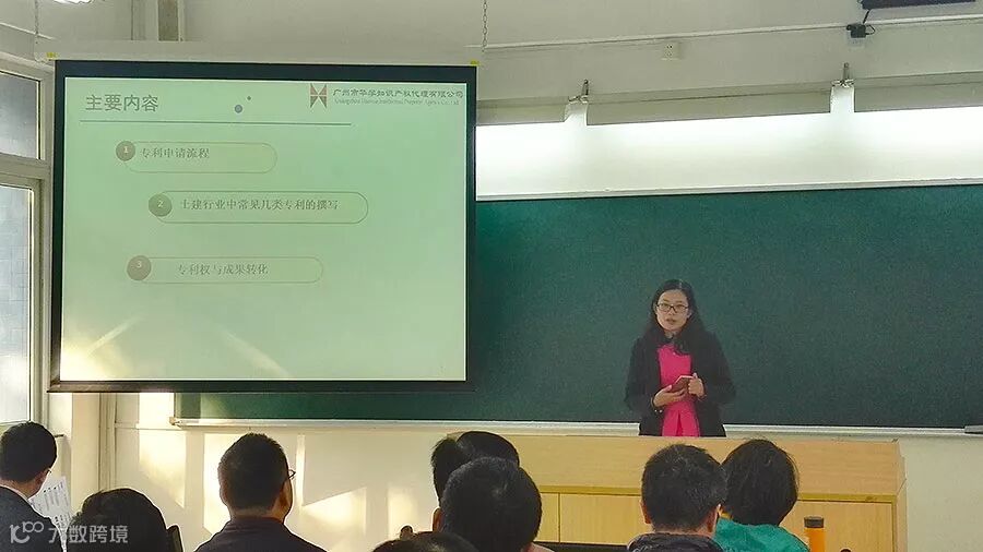 随后,公司股东裘晖详细介绍广州大学专利申请流程和专利基础知识,并通过列举多个例子深入浅出为与会师生代表分享如何结合科研项目进行更有效地专利布局与申请。
