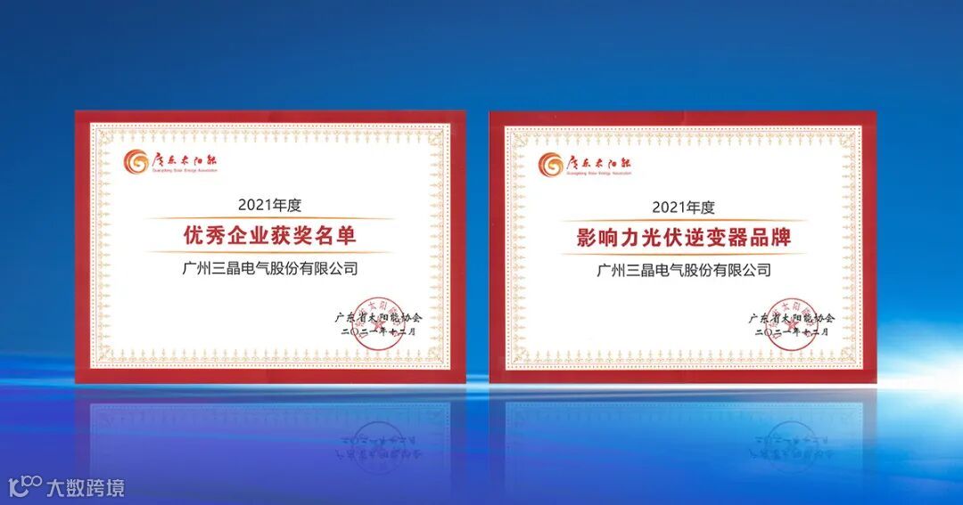 12月10日为表彰和肯定为广东省太阳能行业发展做出杰出贡献的优秀企业,并加强太阳能行业企业的建设,促进广东省太阳能市场和谐可持续发展,广东省太阳能协会开展2021年广东省太阳能行业优秀企业、太阳能行业影响力品牌评选活动。三晶电气凭借优异的品牌实力和众多的自主创新技术,一连斩获“2021年度优秀企业获奖名单”和“2021年度影响力光伏逆变器品牌”两项大奖。