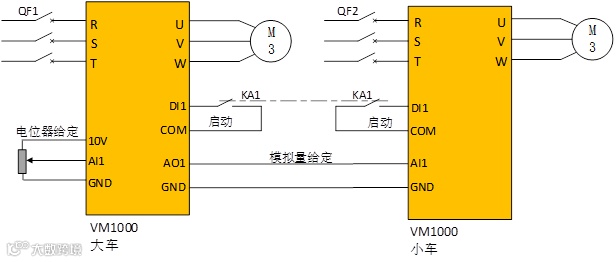 ◀ 同步运行:小车与大车实现同步运行,采用VM1000变频器一拖多的方式来驱动变频电机,使两台电动机达到同步运行,加减速平稳无冲击。