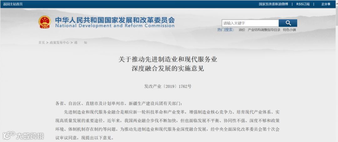 关于推动先进制造业和现代服务业深度融合发展的实施意见(发改产业〔2019〕1762号)http://www.ndrc.gov.cn/zcfb/zcfbtz/201911/t20191115_1203505.html