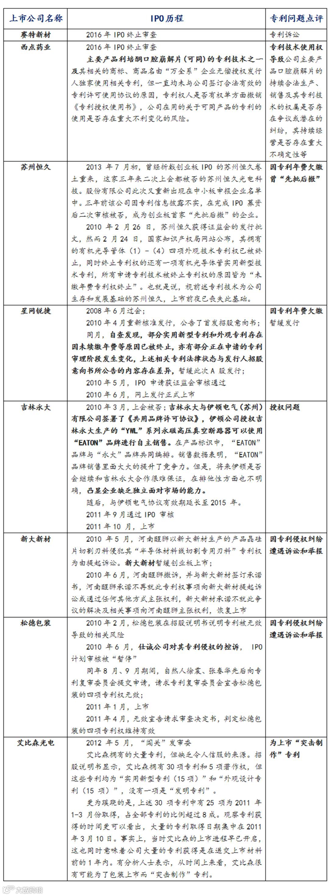 近年来许多企业因为专利问题导致上市不顺已经是屡见不鲜了,虽然竞争对手主要是以发起专利诉讼或专利无效还围堵拟上市企业,但是也不少企业因为自身知识产管理环节出现问题而导致上市不顺。本期将呈现部分企业的由于专利问题导致上市不顺的整个过程,旨在为中小企业在知识产权管理方面提供一定的启示。