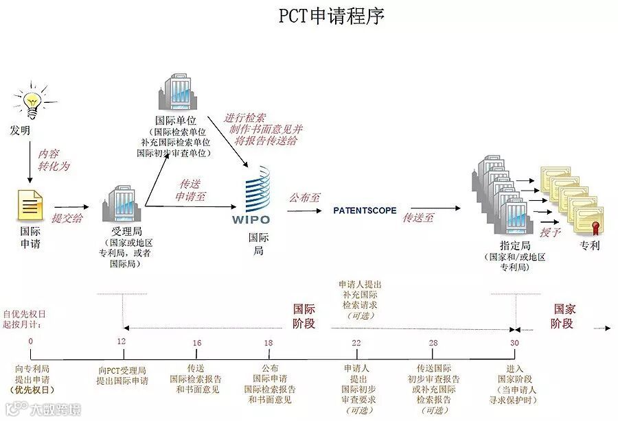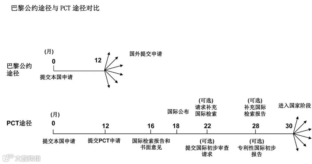 (3)PCT 途径:申请人可以直接申请PCT,或者在巴黎公约规定的首次申请的申请日起12个月内提交PCT申请,该申请在PCT 所有成员国内有效,从首次申请的申请日(优先权日)起,申请人具有30个月的时间来考虑是否进入到具体的国家去申请专利,因此为申请人争取了更多的时间来考虑和准备。