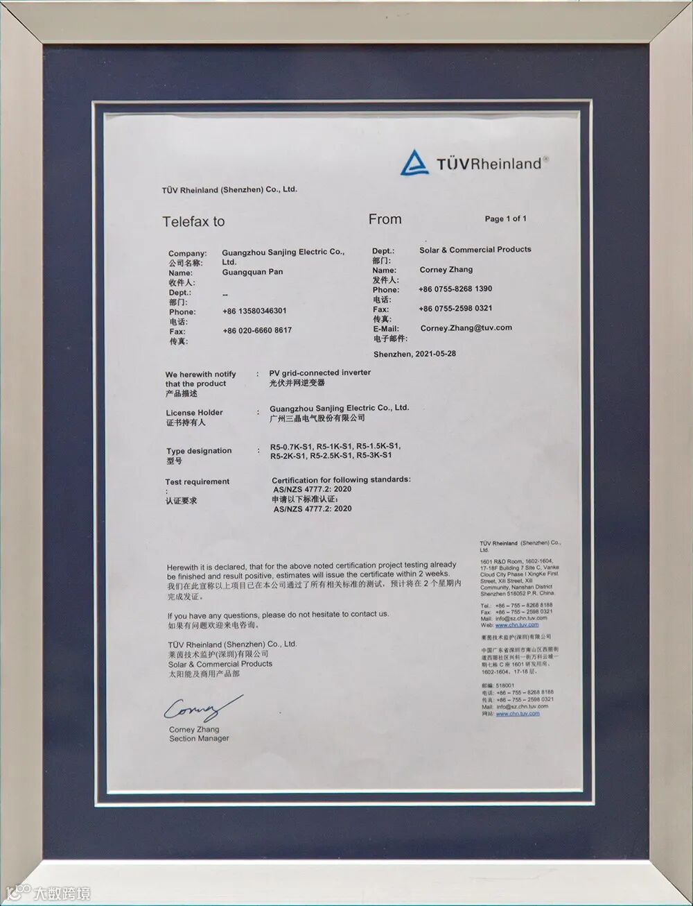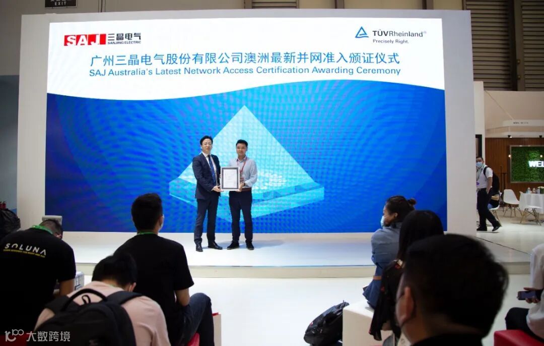 另外,三晶电气在展会期间举办了“广州三晶电气股份有限公司澳洲最新并网准入颁证仪式”,TÜV莱茵全球电力电子产品服务副总裁兼大中华区太阳能与商业产品服务总经理李卫春总为三晶电气颁发证书。澳洲作为光伏行业前沿区域,发展迅速,并网准入要求也一直在更新,对逆变器的性能要求更为严苛,证书的获得更是彰显了三晶电气的品质与实力。