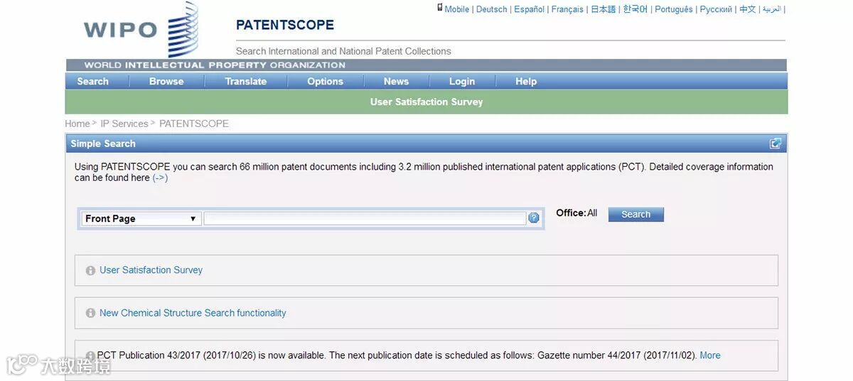 简介:世界知识产权组织成立于1967年,是联合国下属组织,该专利数据库为全球用户提供方位专利合作条约的专利申请,收录了上千万的专利文献,还对不同国家和地区专利局的专利文献进行查询。