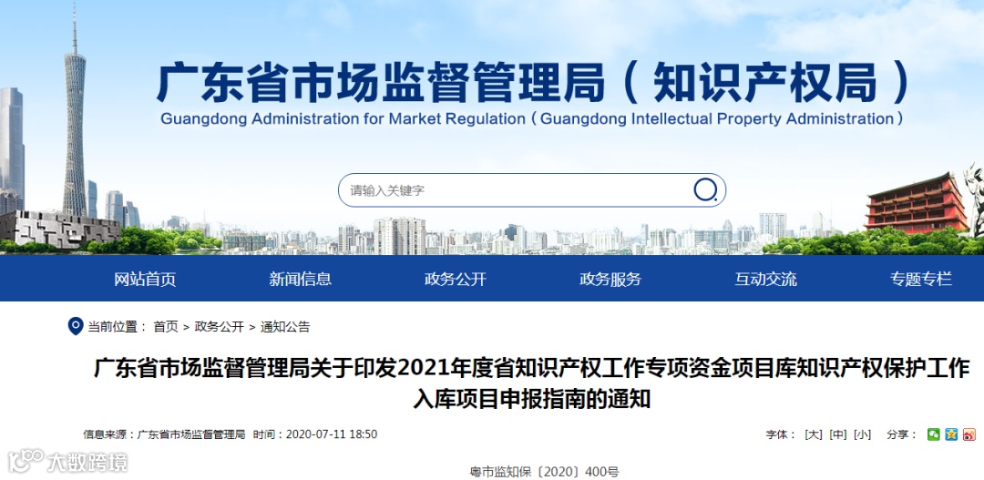 为全面加强广东知识产权保护工作,规范使用知识产权工作专项资金,根据《广东省省级财政专项资金管理办法(试行)》《广东省省级财政资金项目库管理办法(试行)》《广东省促进经济高质量发展专项资金(市场监督管理)管理办法》的有关要求,广东省市场监督管理局制定了2021年度省知识产权工作专项资金项目库知识产权保护工作项目申报指南(见附件1—8,以下简称《申报指南》)。现印发给你们,并将有关申报事项通知如下:
