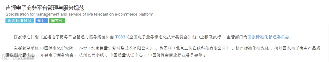 据国家市场监督管理总局(国家标准化管理委员会)官网公示的消息显示,我国的《直播电子商务平台管理与服务规范》已完成了网上公示,已进入起草阶段。这意味着,我国的“直播电商”的国家标准也即将到来!