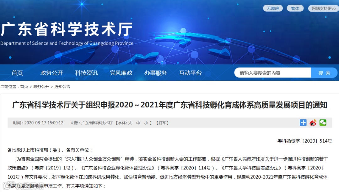 1.2020~2021年度广东省科技孵化育成体系高质量发展项目申报指南