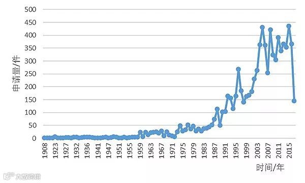 喷嘴式洗碗机是洗碗机洗涤方式中最常用的一种,喷嘴式洗碗机的专利申请趋势与洗碗机的专利申请趋势类似。从1908年至1960年,喷嘴式洗碗机处于起步阶段,专利申请量较少,技术累积还不够。从1960年后随着冲刷臂结构、控制方法等的发展,专利申请量开始增长,至1996年达到专利申请小高峰。1999年至2005年,专利申请呈现快速增长趋势,2006年后喷嘴式洗碗机的专利申请量呈波动式。