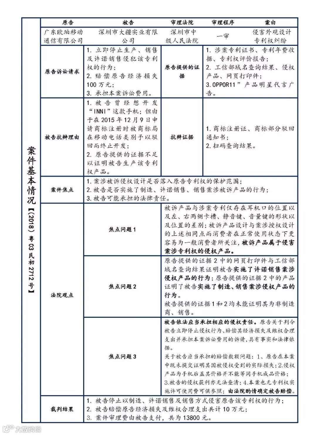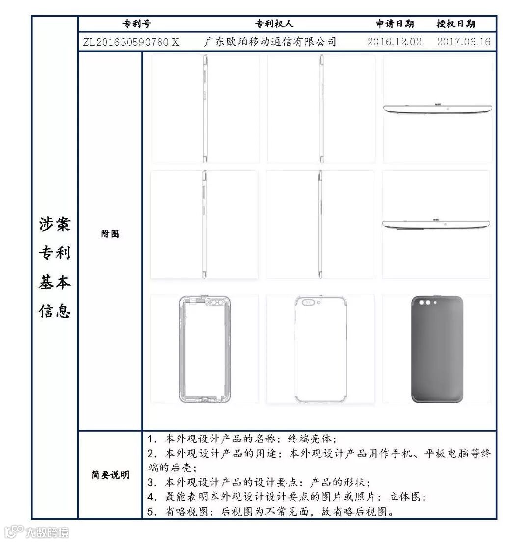 2018年,oppo诉深圳市大疆实业有限公司侵犯其外观设计专利权,涉案专利为ZL201630590780.X。涉案专利是用作手机、平板电脑等终端的后壳,被诉产品是一款手机。其中该案件的焦点问题3中的赔偿数额问题,由于oppo提供的证据并不能支撑其请求的赔偿金额要求,也无专利权实施许可使用费可供参照等原因;一审法院酌情确定被告赔偿10万元,与oppo请求的数额相差10倍。