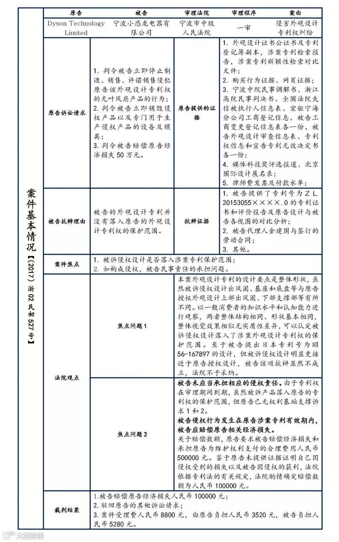 经过进一步调查,我们发现戴森技术公司近年积极进行跨国维权,就该外观设计的专利权已起诉多家中国本土企业。期间,部分被起诉的本土企业或行内其他本土企业就该专利权纷纷提出无效,而大多数企业的无效证据是技术原始国日本的相关文献,但是由于证据不足,这些无效均没有成功。而戴森与宁波小恐龙电器的专利权纠纷中,可以发现戴森公司在维权过程中,戴森公司极可能以其他侵权对象的高管与被告的关系为线索进行了进步一调查,从而发现被告的侵权行为。