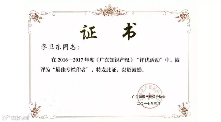 近日,在广东知识产权保护协会组织的《广东知识产权》评优活动中,公司执行董事李卫东再次获得2016-2017年度“最佳专栏作者”荣誉称号。最近一年来,李卫东作为广东省知识产权专家咨询委员会委员,在《广东知识产权》先后发表了《夯实专利代理基础,助推创新驱动发展》、《对知识产权本质的思考》、《专利代理机构股东身份多元化探析》、《从市场角度辨析专利质量》及《专利代理行业改革发展中的几个问题》等高质量文章,获得了同行及社会各界的一致好评。