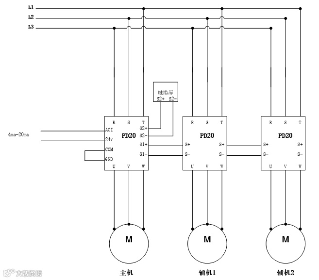 根据实际用水需求系统采用6台7.5KW PD20变频器、6台7.5KW水泵和2个25公斤压力变送器和两个触摸屏,由于现场是两套用水系统,所以分成两套供水系统,每套3台变频器和水泵。该系统可以实现远程操作和监控、自动增减泵、水泵轮换供水等功能。
