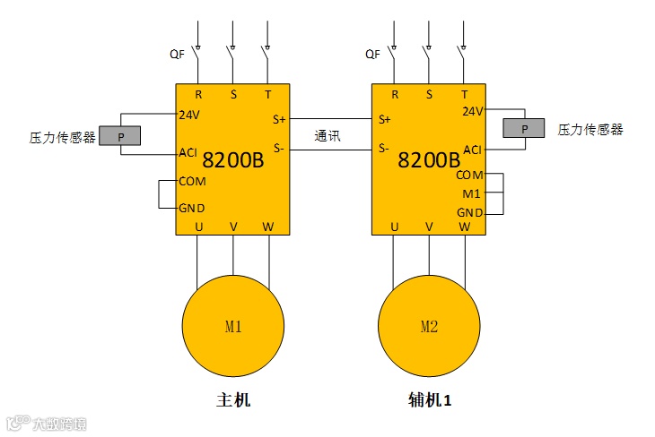 东北某中学根据实际用水需求系统采用2台5.5KW 8200B变频器、2台5.5KW水泵和两个10公斤压力传感器,组成2台泵联机的恒压供水系统。该系统可以实现柔性启停、自动增添泵、自动水泵轮换供水等功能。