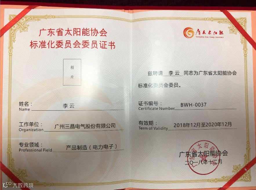 受协会聘请,三晶电气荣幸成为广东省太阳能协会标准化委员会委员。获此殊荣,三晶电气必将砥砺前行,全力配合广东太阳能协会制定好行业标准,服务更多的企业和客户。