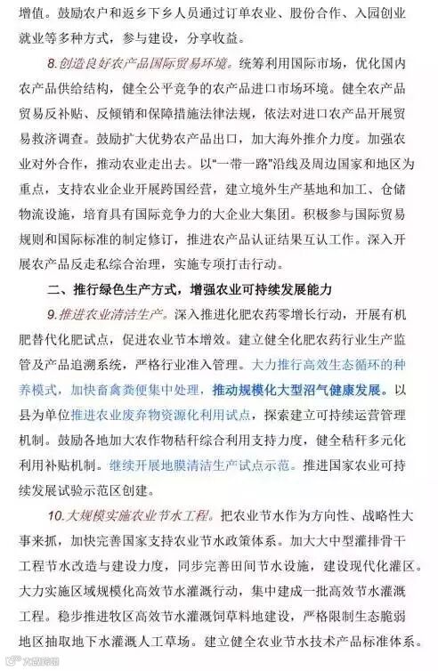 《意见》指出,要大力推行高效生态循环的种养模式,加快畜禽粪便集中处理,推动规模化大型沼气健康发展。深入推进绿色高产高效创建,重点推广优质专用品种和节本降耗、循环利用技术模式。因地制宜推进平原地区农村机井油改电。推进农业废弃物资源化利用试点。实施农村新能源行动,推进光伏发电,逐步扩大农村电力、燃气和清洁型煤供给。