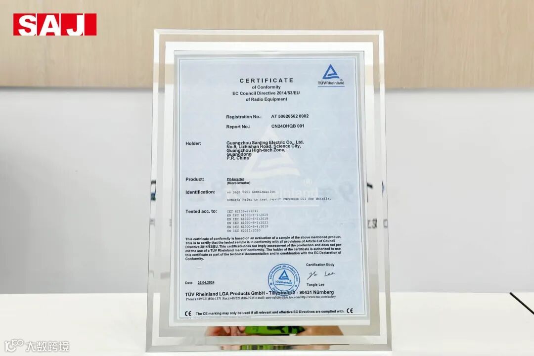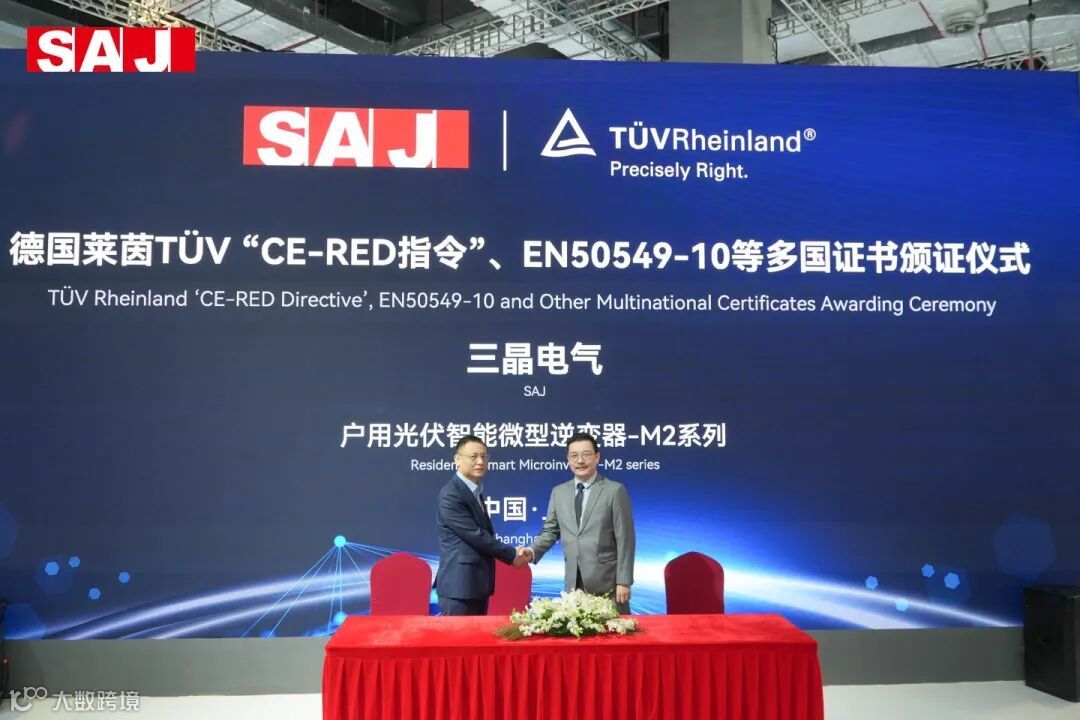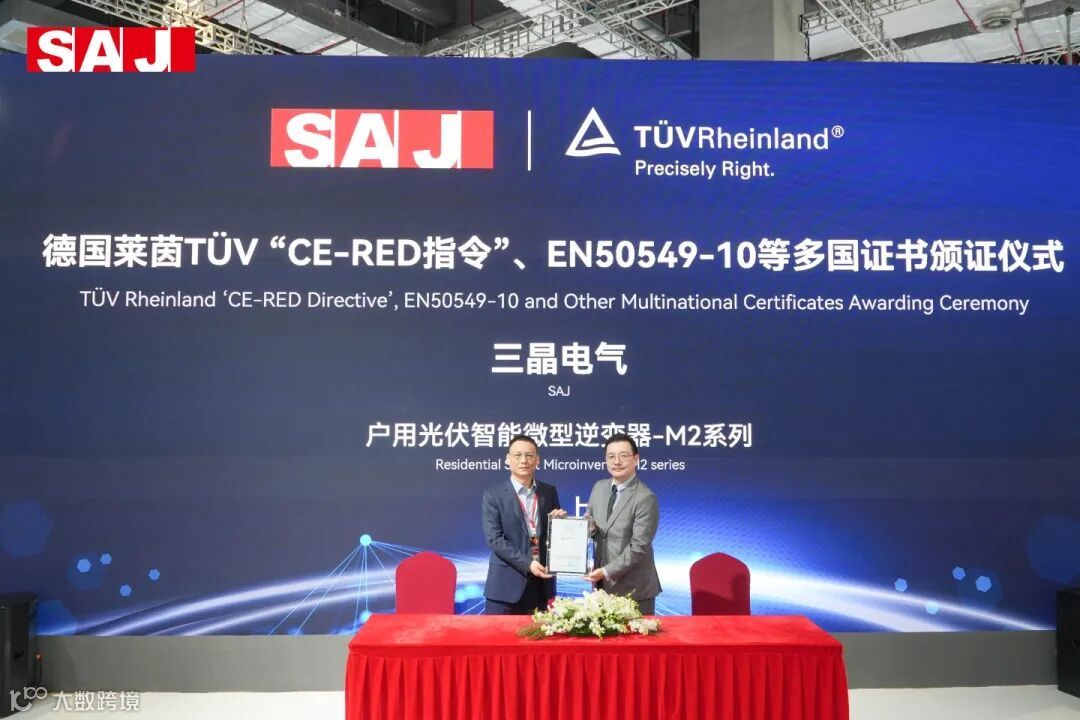 展会上,全球领先的第三方检测认证机构德国莱茵TÜV 正式为三晶电气户用光伏智能微型逆变器-M2系列“CE-RED指令”、EN50549-10等多项国际认证证书。这一举措不仅为该产品系列在拉美、欧洲等全球多个国家的销售提供了坚实保障,更是对三晶电气卓越的专业水准和产品质量给予了高度评价。德国莱茵TÜV大中华区副总经理陈雄先生与三晶电气副董事长幸志刚先生等双方代表共同出席了颁证仪式。