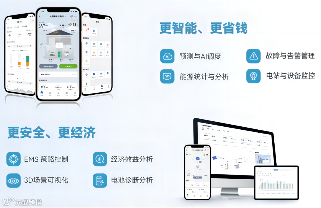 系统提供预测与 AI 调度、电池诊断、能源统计、效益测算、EMS 调控策略、站点监控、告警管理、报表报告、SaaS 配置、运维服务等功能,为家庭和工商业提供高效和优质的能源服务。