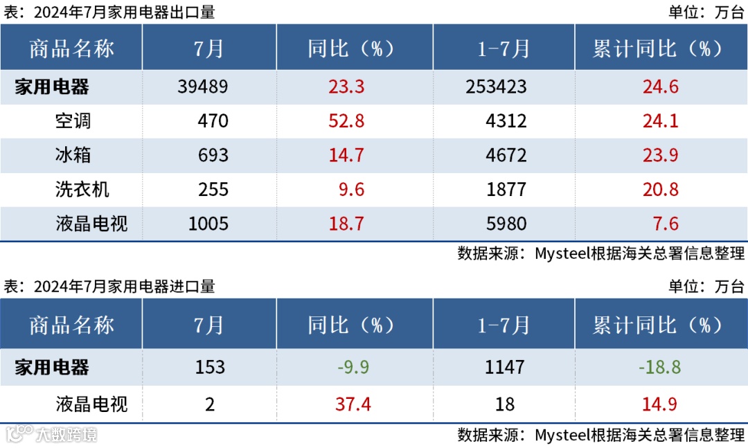 海关总署数据显示,2024年7月中国家电出口强劲,总量达39489万台,同比增23.3%。1-7月累计出口253423万台,增24.6%。