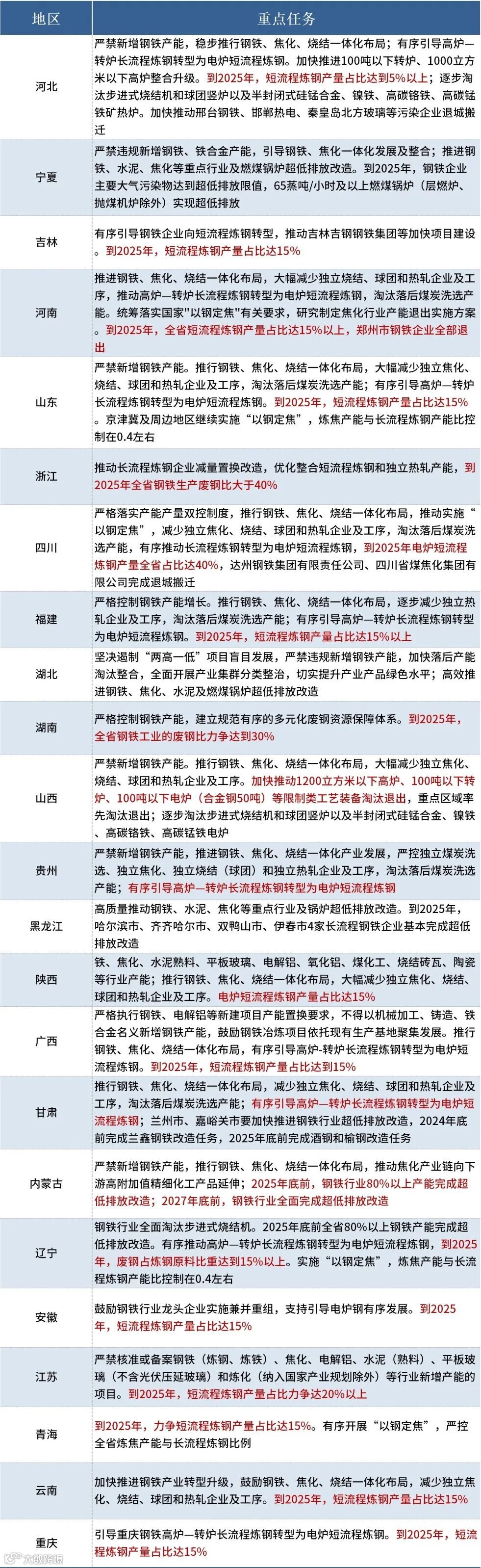 23个省份出台“空气质量持续改善行动实施方案”,要求推进钢铁等重点行业优化升级,包括严禁新增钢铁产能,提出短流程炼钢比例的目标等。具体内容如下: