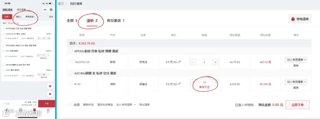 在里面可以实现单选、多选一键下单购买,同时常用清单内具备价格实时更新功能,并且会提醒涨跌情况。所以在雄峰特钢网老板不用催采购,采购也无需打电话询价,通过小程序打开常用清单即可查看最新报价及涨跌数值。