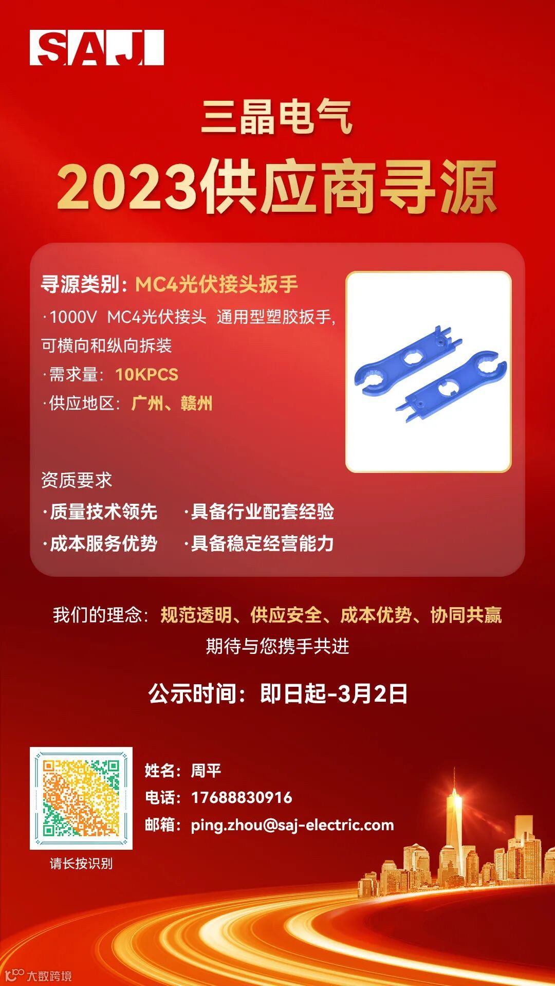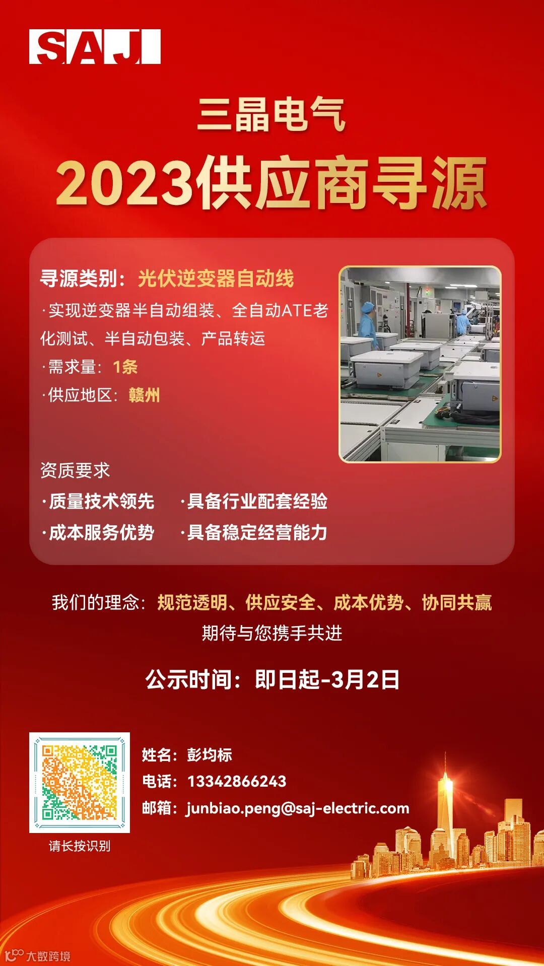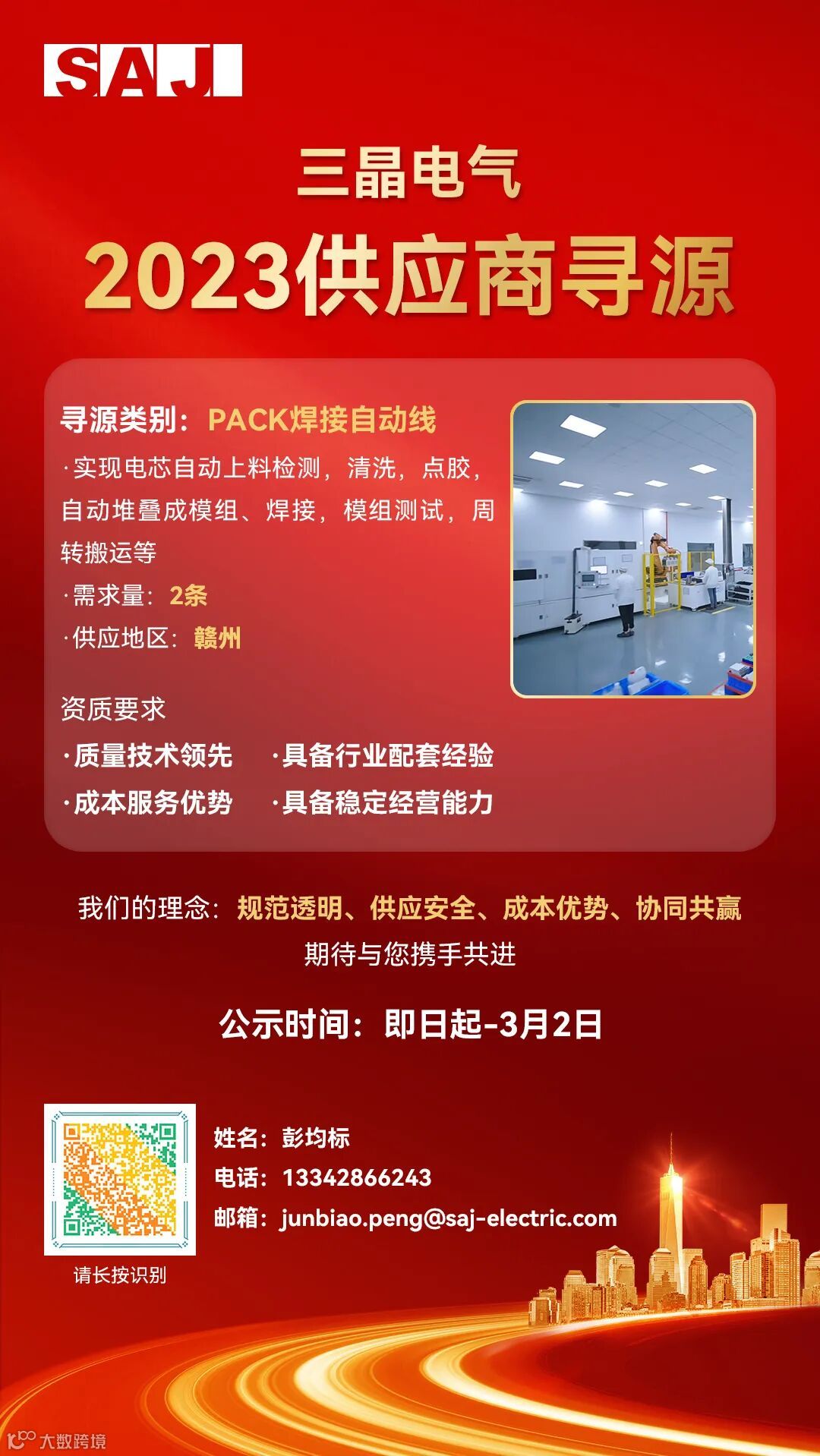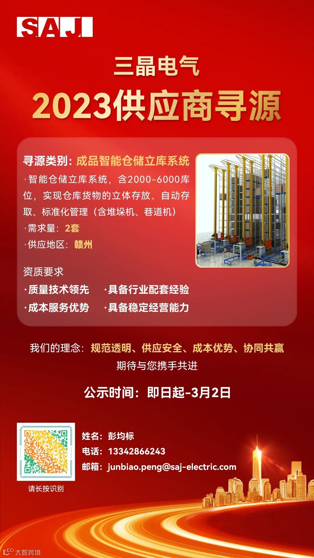 三晶拟对2023年”PACK焊接自动线“、”光伏逆变器自动线“、”成品智能仓储立库系统“等项目公开招募供应商,欢迎所有满足资质要求的供应商积极参与。