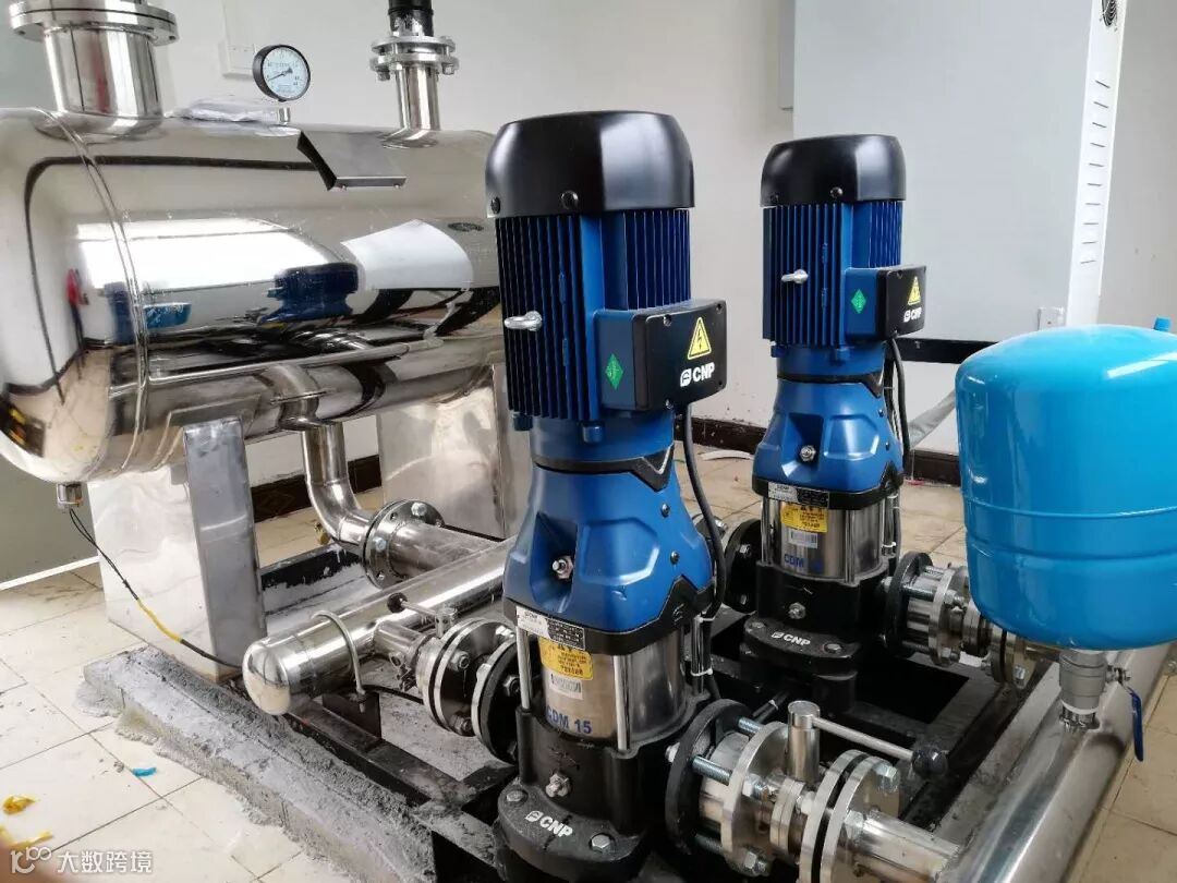 系统原理说明:系统使用两台8100型号变频器做控制,配备压力传感器检测管网水压力。水泵前端安装有无负压水箱,维持管网压力稳定、避免进水压力波动。