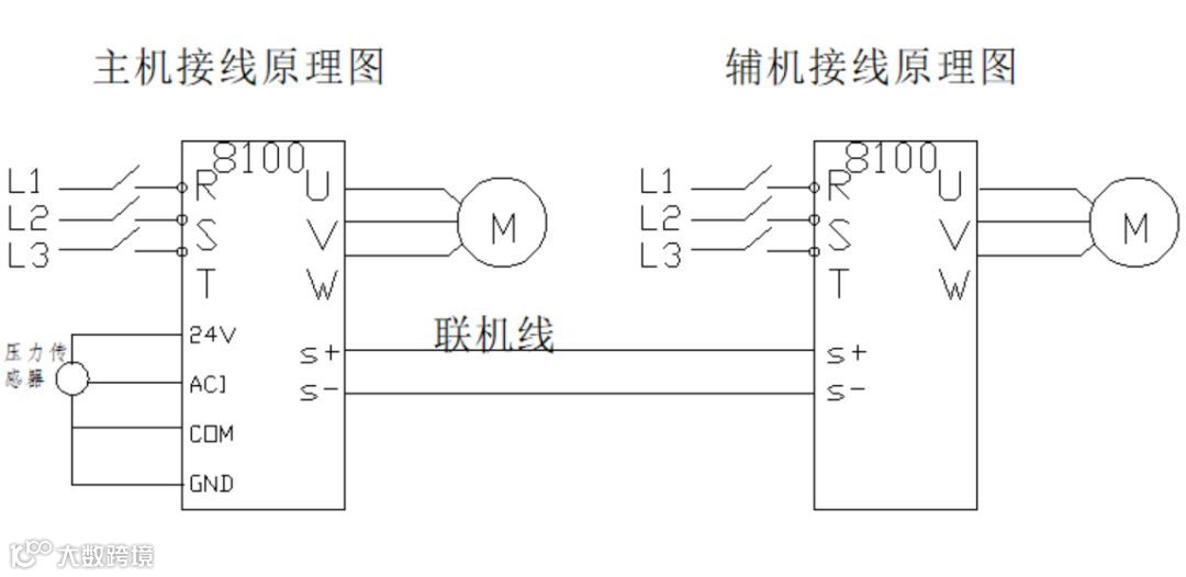变频主机外接压力传感器,根据反馈压力值与设定目标压力值计算结果,控制系统主机与辅机的运行或停止逻辑。