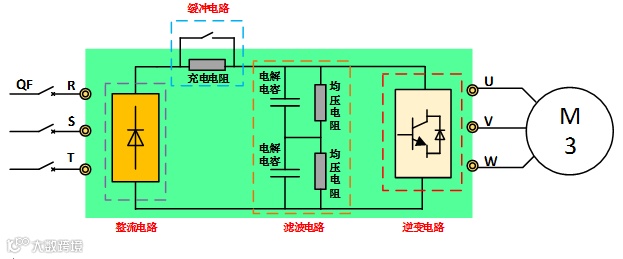 整流电路:主要由整流桥组成;将交流电(市电)经过全桥整流后成直流电。对于三相380V的交流电,经整流后,直流电压理论值为380X1.414≈537V;而单相220V的交流电,经整流后,直流电压理论值为220X1.414≈310V。