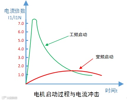用市电直接启动电机,其启动电电流为电机额定电流的5-7倍。这种电机直启情况下,会导致电网电压下降,影响其他用电设备的正常运行。