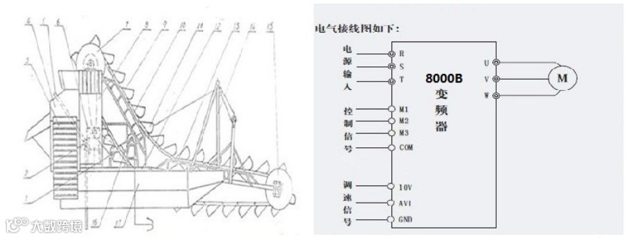 变频器主要应用在挖沙船的挖沙装置上,电机功率为132KW,由于挖沙装置属于超重负载,因此选用变频器功率为200KW,变频器采用外部段子控制及外部电位器调速。