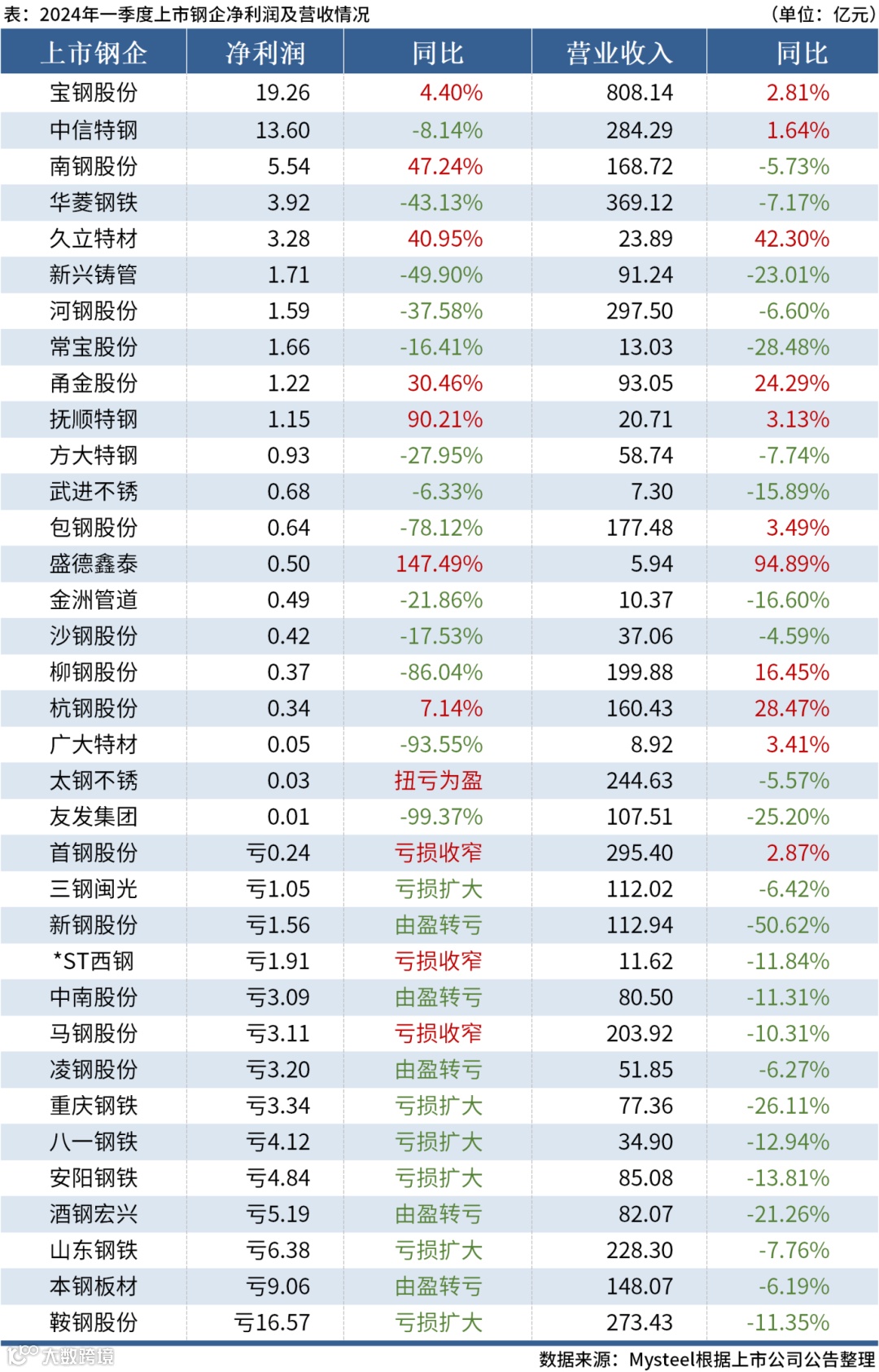 据Mysteel统计,35家上市钢企公布2024年一季度业绩,总营收达4985.41亿元,合计净利润小幅亏损6.27亿元。