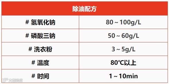 除油是关键,如果工件上油未除净,就会直接影响黑化的质量,出现花斑或发黑膜结合力差,甚至不能上色。在此推荐一个除油配方。