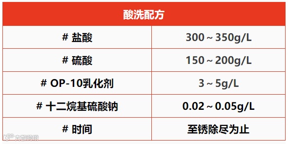 对于锈蚀不太严重的工件,可采用常规的盐酸液除锈、再水洗,对于锈层和氧化皮较厚的工件,推荐采用以下配方: