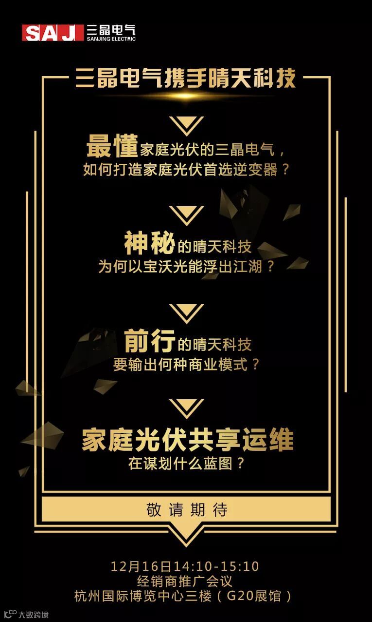 除此之外,三晶电气还将携手晴天科技,在明天的经销商推广大会上为大家带来众多精彩内容!包括:最懂家庭光伏的三晶电气,如何打造家庭光伏首选逆变器?神秘的晴天科技为何以宝沃光能浮出江湖?前行的晴天科技要输出何种商业模式?家庭光伏共享运维在谋划什么蓝图?这些谜底都将在12月16日14:10-15:10经销商推广会议杭州国际博览中心三楼(G20展馆)上为你揭晓!