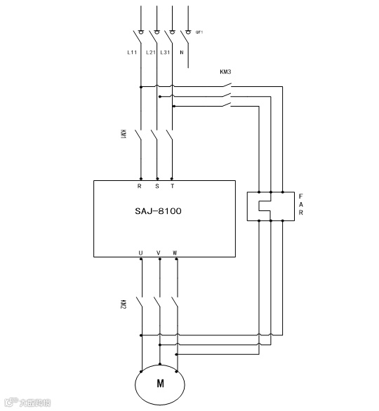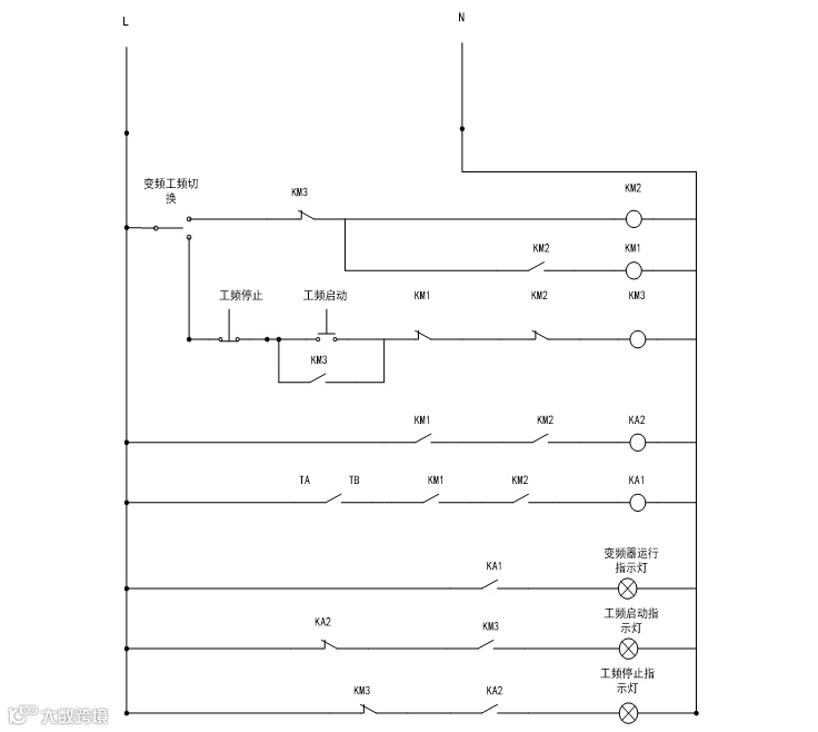 当把转换开关打到工频时,按下工频启动按钮,控制回路交流接触器线圈KM3得电,KM1跟KM2失电,主回路交流接触器常开触点KM1跟KM2断开,KM3闭合,工频启动。