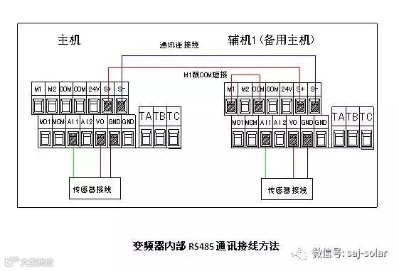 主机的S+,S-端子分别与辅机的S+,S-端子相连,采用的是双绞线或者屏蔽线。案例系统具有备用主机功能,即当主机发生不可恢复的故障时,备用主机在满足条件后自动切换成主机,继续控制其他辅机运行,发生故障的主机不会影响系统正常运行。备用主机需要接压力传感器,且M1端子与COM端子短接。不需要备用主机时,辅机不需要装压力传感器,M1端子与COM端子也不需要短接。系统最多可6台PD20进行联机。