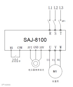 三相380V电源分别接8100水泵变频器的RST端子,8100水泵变频器输出端子UVW接电机上;外部电位器接到AVI,GND和10V端子上,用于改变水泵变频器的运行频率;外部启动按钮就接到M1与COM端子,用于启动水泵变频器。