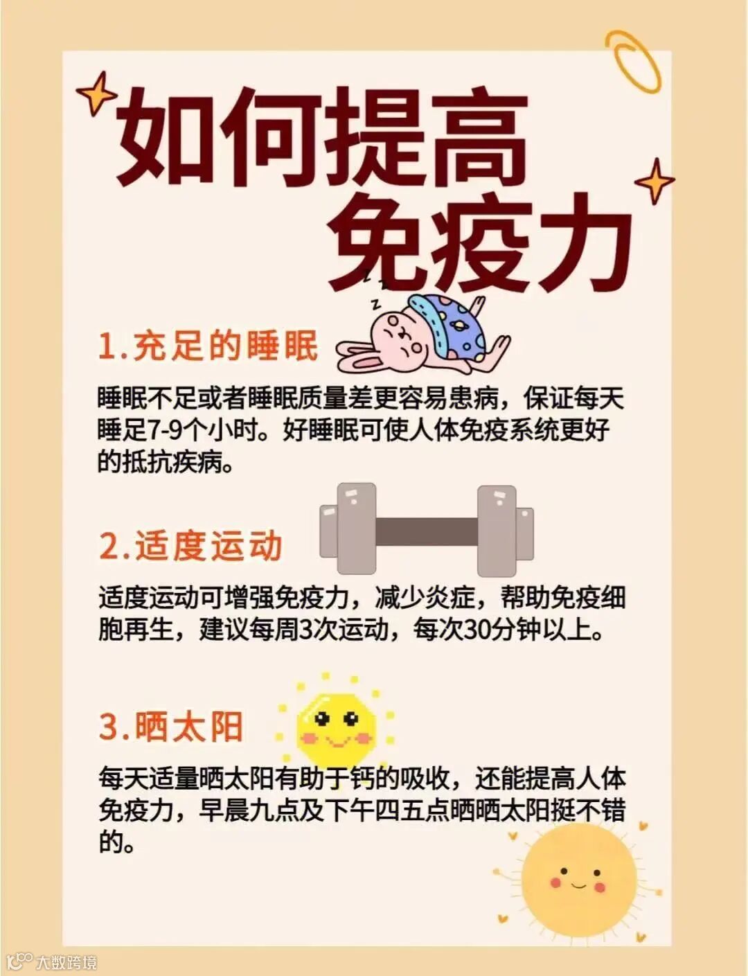 除了饮食之外,我们还是需要注意其他的包括:保证足够的睡眠、经常锻炼、保持良好的个人卫生、接种必要的疫苗、保持健康的体重、不要吸烟、尽量减少压力。
