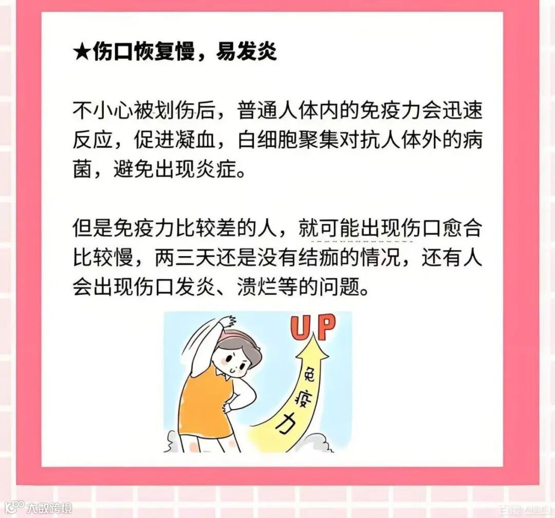 3.伤口愈合缓慢(如果人的免疫系统反应迟钝,则皮肤无法再生,伤口会难以愈合)