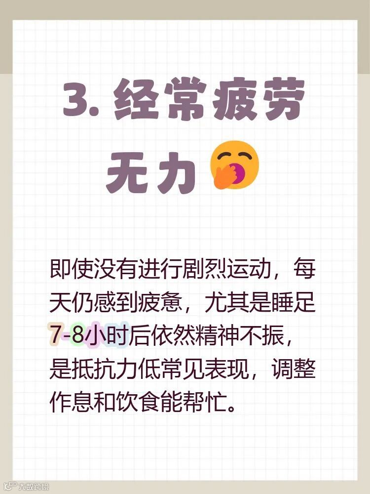 6.经常感到疲倦(如果人在保证足够的睡眠后仍然精疲力尽,我们需要考虑是否是免疫系统在发出告警)