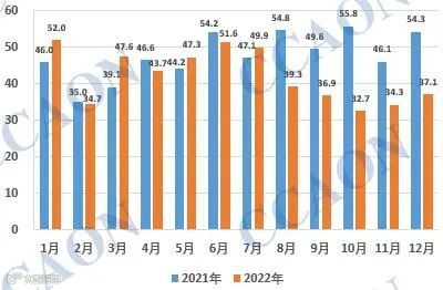 根据最新的海关统计数据,2022年12月份我国PVC地板出口量为37.10万吨,环比上月出口量34.29万吨增加8.19%,同比去年出口量下降31.66%。2022年1-12月份我国PVC地板累计出口507.07万吨,与去年同期572.73万吨相比,减少11.46%。