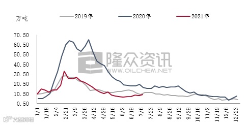 从上面社会库存走势,不难看出,2021年的社会库存均大幅低于往年同期。截至7月11日,国内PVC社会库存在14.79万吨,环比增加6.10%,同比下降41.77%;其中华东地区在10.79万吨,环比增加6.41%,同比下降47.37%;华南地区在4万吨,环比增加5.26%,同比下降18.37%。