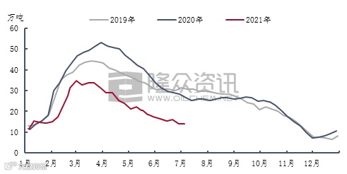 从厂区库存来看,2019年的厂区库存数据与2021年走势基本一致,2020年因为疫情的原因,厂区库存数据偏高。也就是从厂区库存来看,今年的数据较往年看不出有多大变化。而表现库存数据的另一个重要数据就是社会库存。