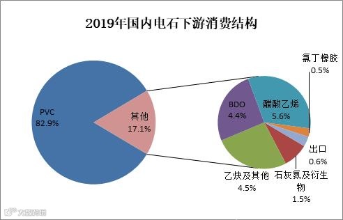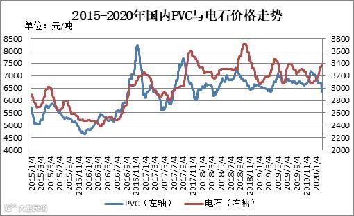 电石下游产品包括PVC、聚乙烯醇、氯丁橡胶、石灰氮以及双氰胺等,其中PVC的消费比例约占80%左右。电石下游产品中,PVC一家独大,因此,PVC行业需求的变化对电石市场影响较大。一般而言,当PVC行业的需求增加时,电石价格表现较强势;当PVC行业的需求减少时,电石价格则面临下行压力。例如2019年国庆长假前夕,PVC企业积极备货,电石价格小幅反弹;国庆节后至11月,PVC企业集中检修,对原料需求减少,电石价格弱势下跌。