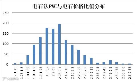 PVC和电石互相影响、互现制约,因此两者的比值相对稳定。统计近五年的数据发现,PVC与电石的比值大致在1.7至2.7之间波动,呈正态分布,其中有约90%的比值分布在1.85-2.35之间。比值超出该区间时,大概率回归。比值回归的逻辑是,比值偏低时,PVC企业的生产利润较低,此时企业生产积极性不高,供应减少推动PVC价格上涨;与此同时,PVC企业对原料的需求减少,电石价格面临下行压力,比值因此逐渐扩大。反之亦然。