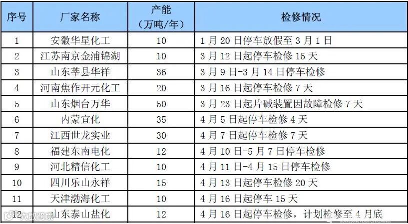 表1 2020年1-4月国内烧碱厂家装置停车检修统计