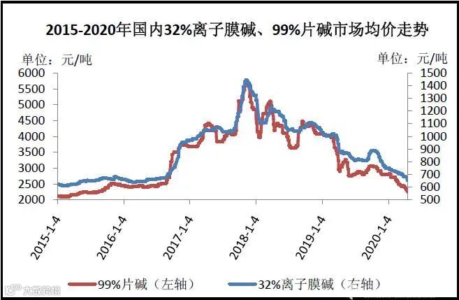 图1 2015-2020年国内33%离子膜、99%片碱市场均价走势对比