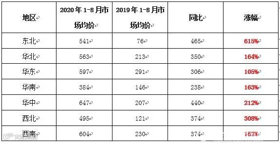 表1 2019-2020年1-8月国内槽车液氯市场均价对比统计