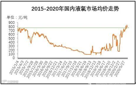 2020年,受全球公共卫生事件持续发酵影响,大宗商品价格多数呈现下行态势。然而液氯却逆势上扬,成为市场的黑马。2020年年初,液氯价格短暂下探后,在终端需求强劲支撑下,市场价格持续反弹。截至2020年8月初,国内液氯市场均价报789元/吨,较2月低位价格上涨626元/吨,涨幅高达384.22%,价格创2015年以来新高。液氯价格的高位,扩展了氯碱行业整体盈利空间,成为氯碱企业的香饽饽。